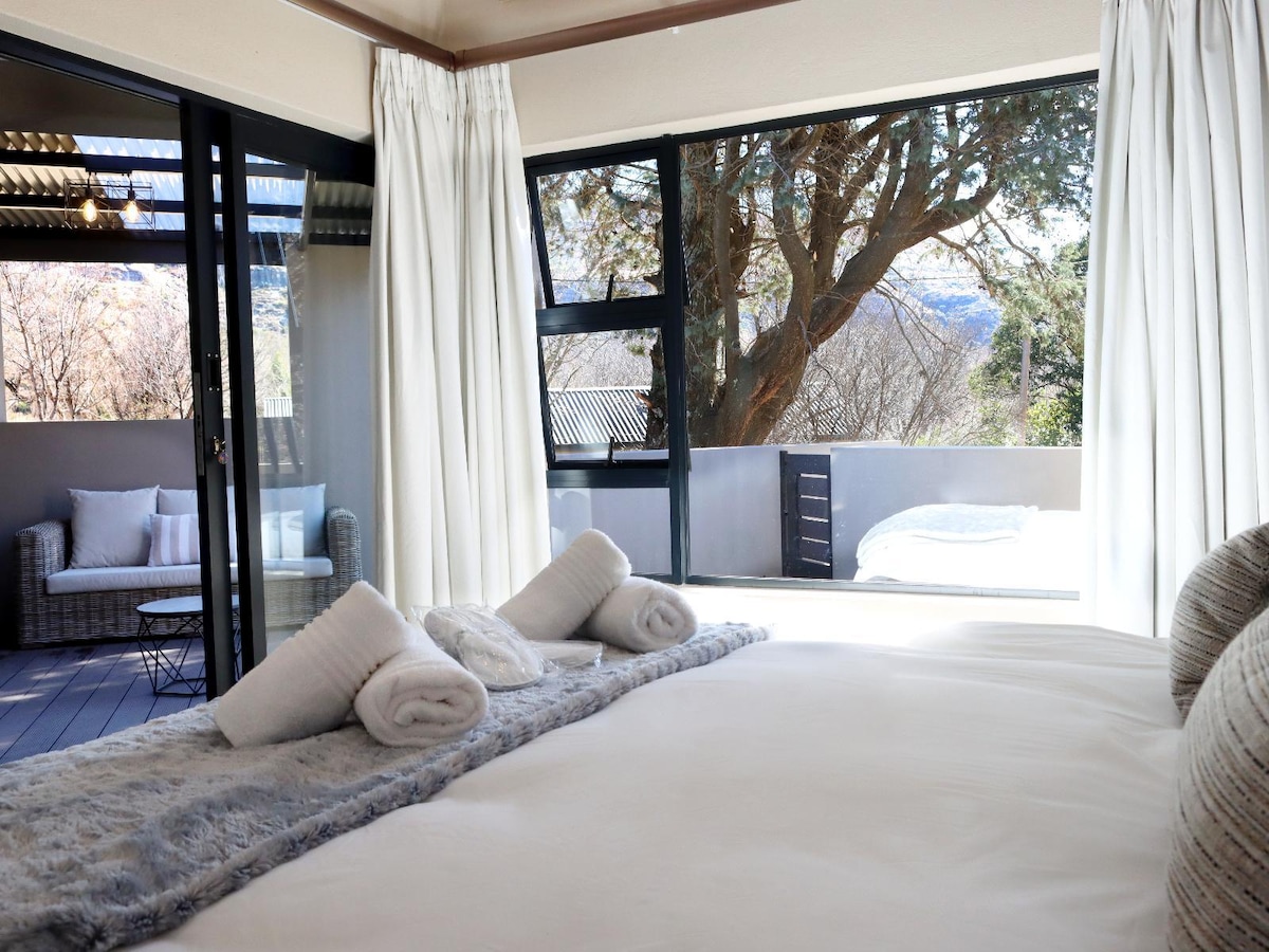 The studio is a large apartment ideal for a couple. It has a large corner tub, luxury Queen bed, sitting room with a fire place and fully equipped kitchen with a stove and microwave. There is a private entrance with a patio and braai place with the amazing view over the mountains. The decor is fun and eclectic but still very warm and cozy. The studio is situated in Clarens town, walking distance from the town square (400m). It is a romantic getaway for a couple or honeymooners.