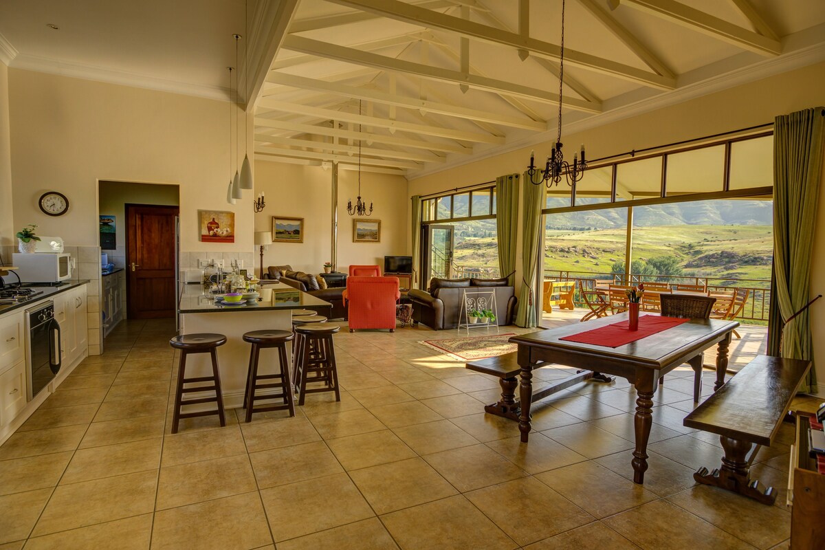 A stunning house filled with bright, natural light. River frontage and valley and mountain views. Two sitting rooms, both with DSTV so you can have sport and cooking on at the same time! Only 6 minutes drive from The Clarens Square and 26 restaurants, yet you can unwind completely in the peacefulness of the wind and sunshine. Lovely walks. Electric blankets and wood burning fires , fully equipped kitchen, 4.5 bathrooms for 6 bedrooms including one with 4 bunk beds. It's huge but homely.