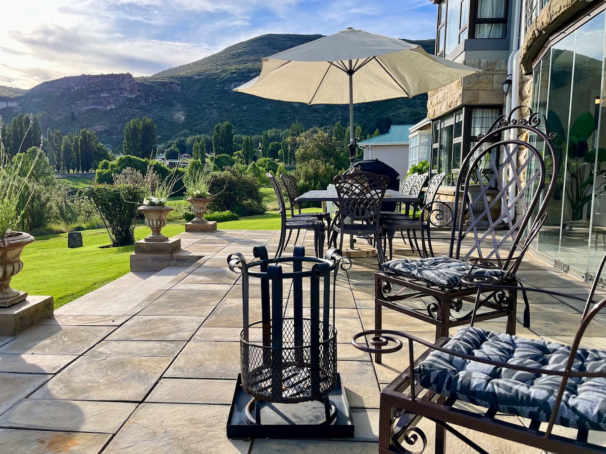 360 degrees mountain views. Tranquil and serene. Come and relax whilst enjoying one of the most beautiful towns in South Africa. Clean and beautiful kitchen, lounge and 2 bedrooms with en-suite bathrooms. HOT TUB. Porch and Braai. Only 5km from the centre of Town but feels as if you are far away with the best uninterrupted views. Enquire today if you have any questions or assistance in your stay with us! 🤍 (please note that this unit is situated next to another but is still completely private)