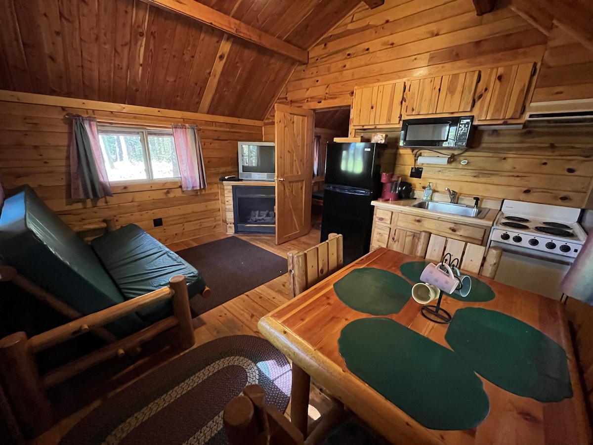 Welcome to Cozy Embers Campground & Cabins! Settle in and relax in our Deluxe Cabin, perfect for a peaceful getaway. This charming one-bedroom cabin features a full bed, an ensuite bathroom with shower, and a comfortable living room with a full-size futon and gas fireplace. Enjoy a mini kitchen with full-size fridge, stove/oven, microwave, coffee maker, and dining table for four. Bed and bath linens are included. Outside, unwind by the firepit or sway on the porch swing and soak in the quiet.