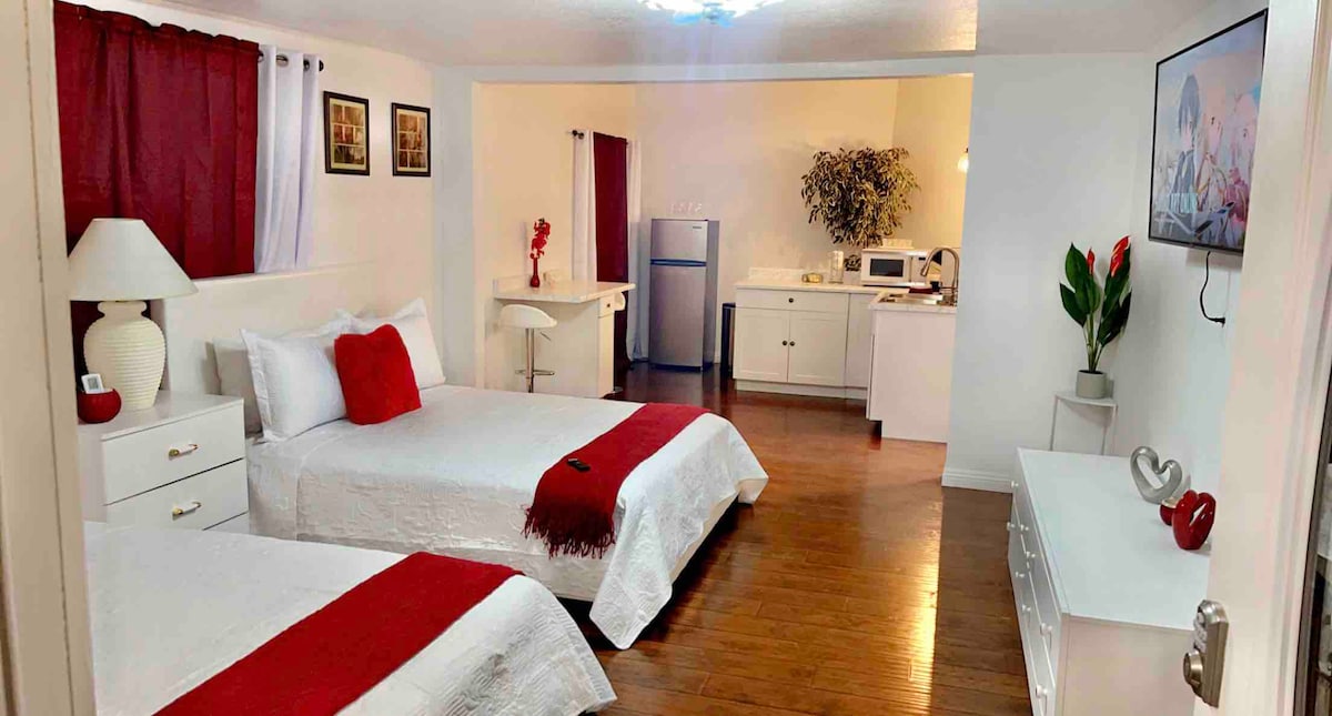 Luxury Guest House with full kitchen and home amenities, comes with a queen luxury mattress bed with a Futon Sofa bed that can accommodate one more adult or 2 children. The place is a guest house with it’s own private entrance on the side of the house can’t missed the pavers way leading you to the entrance gate. 5 mins from the airport and 5-10 mins to the strip it is a great location. We’ve got cameras, for your protection and ours we have cameras filming only the front of the property.