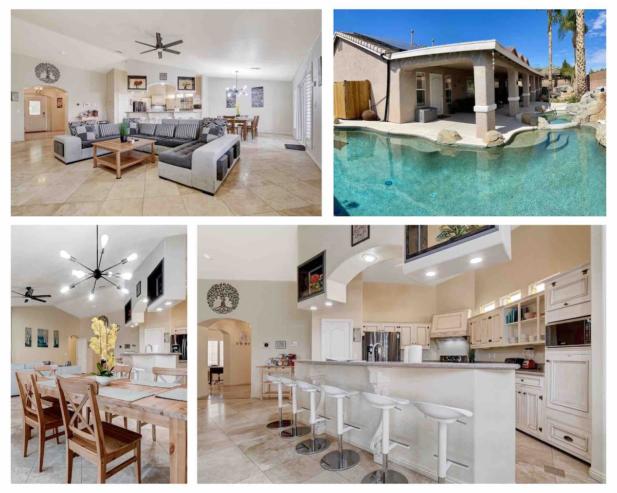 4 bedrooms (1 King/3 Queens), 2.5 bath/ 2200 sq ft home with pool/spa and putting green (pool heat xtra). Games room, well stocked kitchen, living room with 60” smart TV, beautiful heated pool & relaxing spa. Waterfall, & putting green help you enjoy beautiful Henderson in the Mission Hills area. 20 min drive to Las Vegas strip or Boulder City. Outdoor space includes lounge chairs on newly resurfaced pool deck, outdoor table with seating/ lounge area on covered patio. See details for more info.
