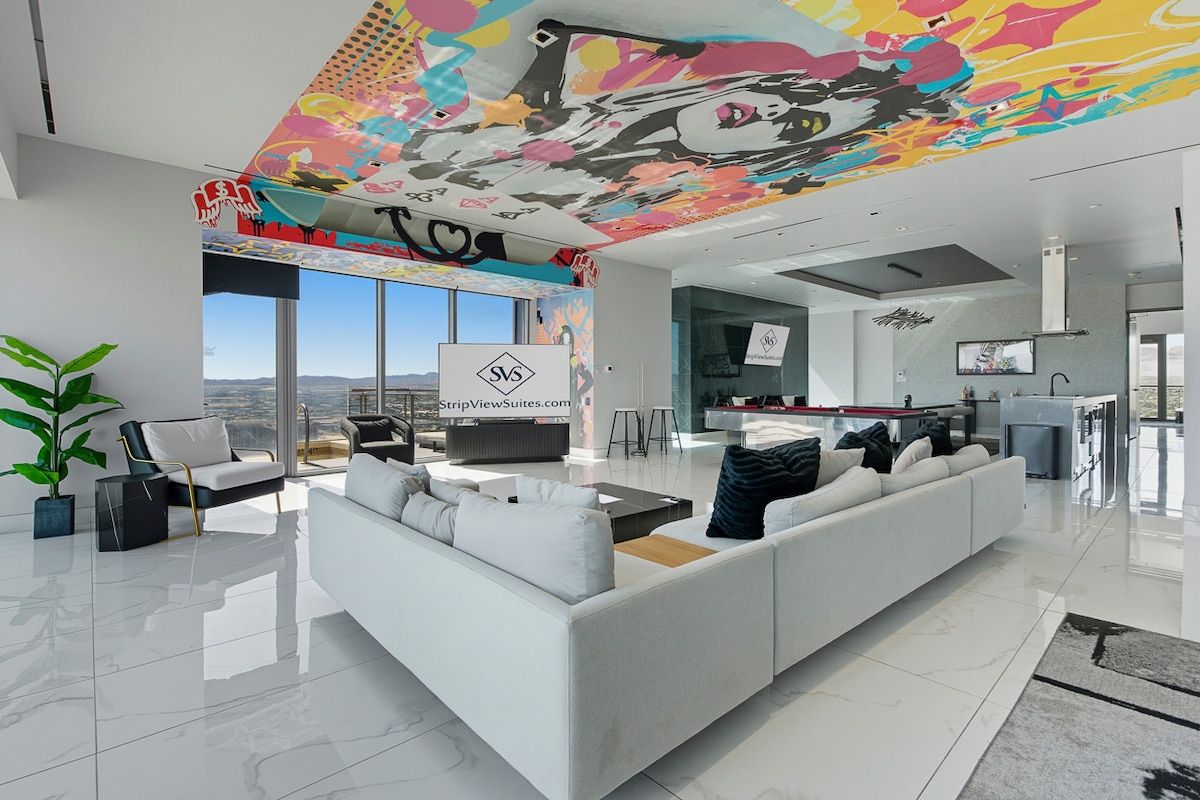 Experience 57th-floor luxury in this 3,300 sq ft Palms Place Penthouse featuring a private terrace Jacuzzi overlooking the Strip. Enjoy two bedrooms (king, pull-out sofa + two queens), two spa-style bathrooms, full kitchen, pool table, poker table, and modern living areas with panoramic views. Guests receive 24/7 StripViewSuites support plus full access to Palms spa, pool, gym, valet, and concierge for a resort-caliber stay. *The pool is closed for the winter season (October through March)*