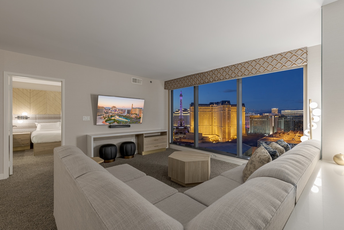 🏙️ Location & Accessibility 🎰 Situated adjacent to the Las Vegas Strip 🚝 Near Paris Monorail Station 🍔 Walking distance to shops, restaurants, and entertainment 🎲 Connected to Planet Hollywood Casino and Miracle Mile Shops 🌟 Signature Amenities 💦 Private oversized jetted hot tub 🎬 HD home theater projector with 8-ft screen 🌃 Floor-to-ceiling windows with blackout shade 🏨 Shared Resort Amenities 🚫 Resort Fees 🚗 Free Self-Parking 🏊♂️ Swimming pool and Spa 🏋️♂️ Gym