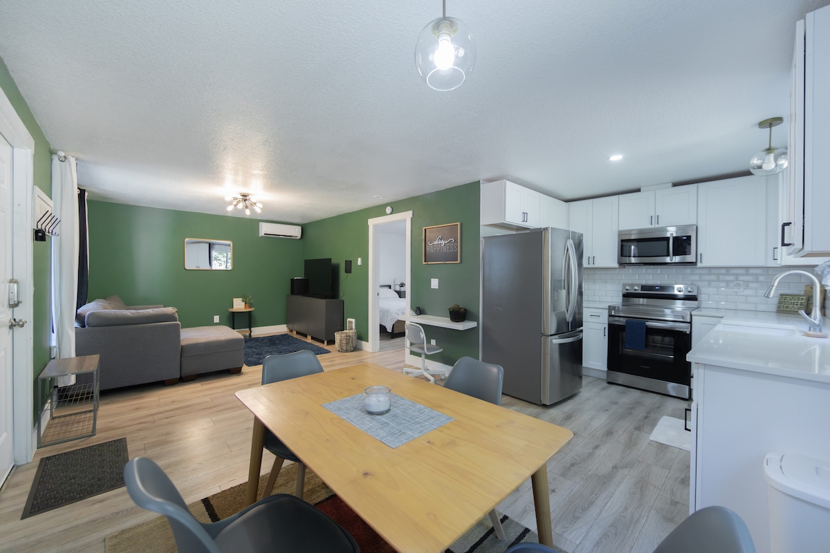 Converted detached garage into a new, bright, studio. I love hosting people from all parts of the world. I live right next door, so I’m available if you need anything but I respect your privacy. *No stairs leading up to, or in the apartment *Off street parking *EV (electric vehicle) fast charging station *Heated floors in bathroom *Full kitchen *55 inch Smart TV *A/C *Easy freeway access *Close to public transportation
