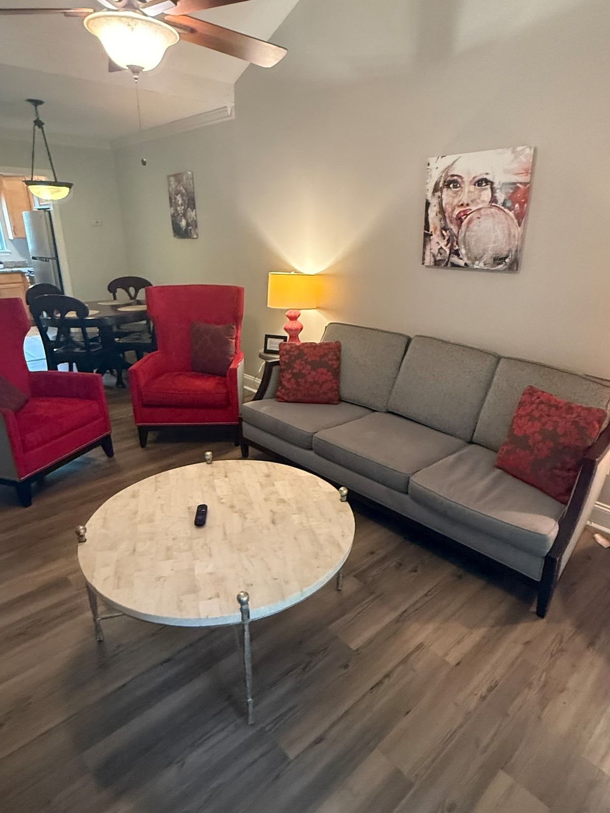-Almost 1200 tastefully designed square feet - corner unit on the ground level -Spacious living and dining area with plenty of room for entertaining -1 mile walk or short drive to Sandord Stadium, Classic Center and Downtown -King beds and private bathrooms for each bedroom -WIFI, 55” Smart TV with full cable + streaming options -Fully stocked and equipped kitchen -Free and convenient parking just steps from the front door -Private back patio