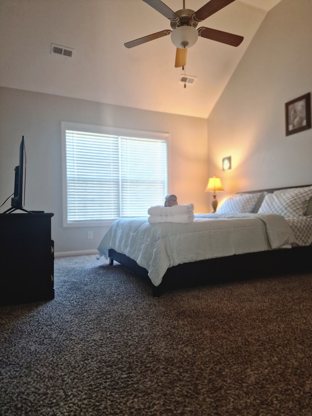 Large room with King bed and additional roll-out beds and/or air mattress available. Dog friendly. Sleeps 4-5 comfortably including the additional bed options. Public areas include living room, game room, kitchen, two bathrooms, and back patio with outdoor seating and eating area. Host is on sight and your safety and security is a priority with individual access codes for each room and security system to monitor property. You will feel safe and cared for in the beautiful, clean home.