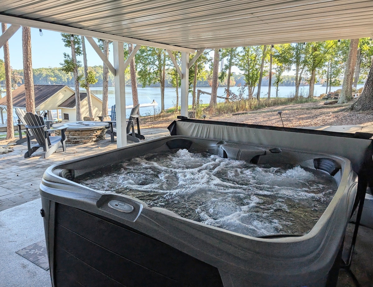 BRAND NEW (2022) custom lakefront A-Frame Cabin. Mid-Century Modern. You'll love the stylish cottage & all the outdoor living/playing. Close walk to your own private dock (2 boat slips) and boat ramps close by. Located right on Kerr Lake (aka Buggs Island). NEW for 2024; ALL NEW BATHROOM, NEW stable internet, concrete sidewalk, Solostove firepit patio, NEW hot tub, patio lights, gas grill, outdoor shower. Toys left out; wagon for hauling, kids kayak, adult kayak, paddle board, and beach chairs.