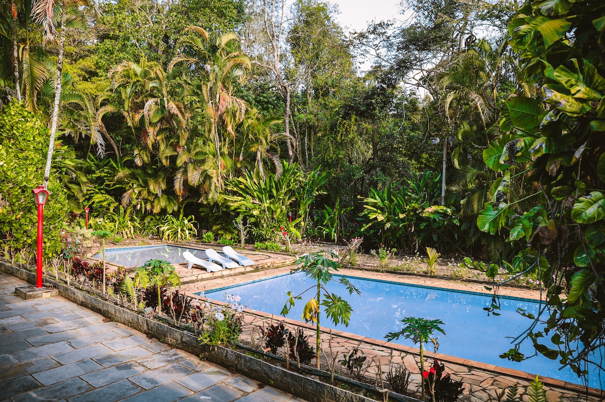 A Pousada Flores e Frutos é um refúgio em meio à Mata Atlântica em Carmópolis de Minas, ideal para famílias e grupos. Oferece 6 quartos (3 suítes), 5 banheiros, sala de TV, cozinha americana equipada, internet Starlink e estacionamento coberto. Possui 2 piscinas, sauna a vapor, churrasqueira, orquidário e 3 lagoas. Café da manhã opcional por R$30/pessoa. Localização privilegiada a 2 km do centro, a 5 minutos de asfalto (MG-270) e ao lado do novo Supermercados BH. Venha conhecer e se surpreenda!