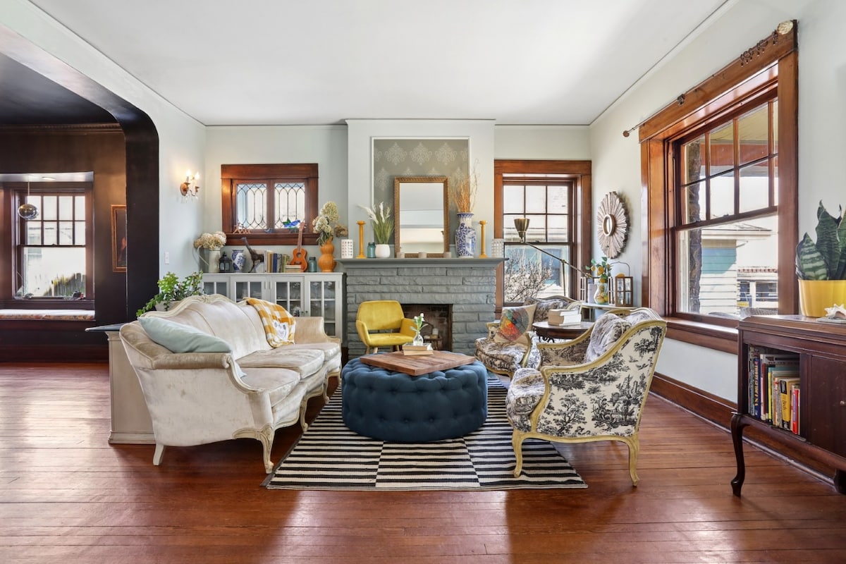 A 125-year-old bungalow packed with personality. Inside you’ll find curated worldly décor, many lounge spaces, and the house’s most famous feature: the Lucky Kitty Tiki Lounge, a hidden bar built inside the old garage. Outside, relax in the barrel sauna, cold plunge, and stock tank pool, gather around the fire pit, and unwind under the string lights after a night exploring Kansas City. It’s a one-of-a-kind stay just minutes from downtown, the stadiums, and some of the city’s best restaurants.