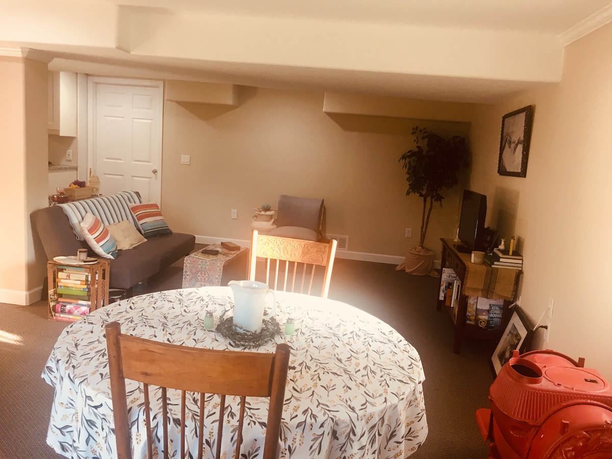 This newly remodeled, two bedroom basement apartment with living room, full bath, and kitchenette is located just outside Kansas City. Come relax and recharge in the country while still having quick, easy highway access to what brings you here. One king bed in one room and a triple bunk bed plus a twin in the other. Our place is perfect for 6 people. We love hosting families with kids!