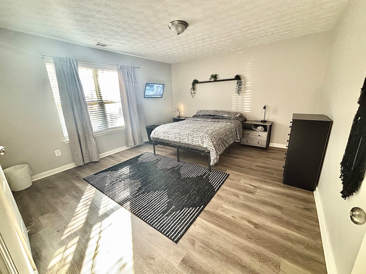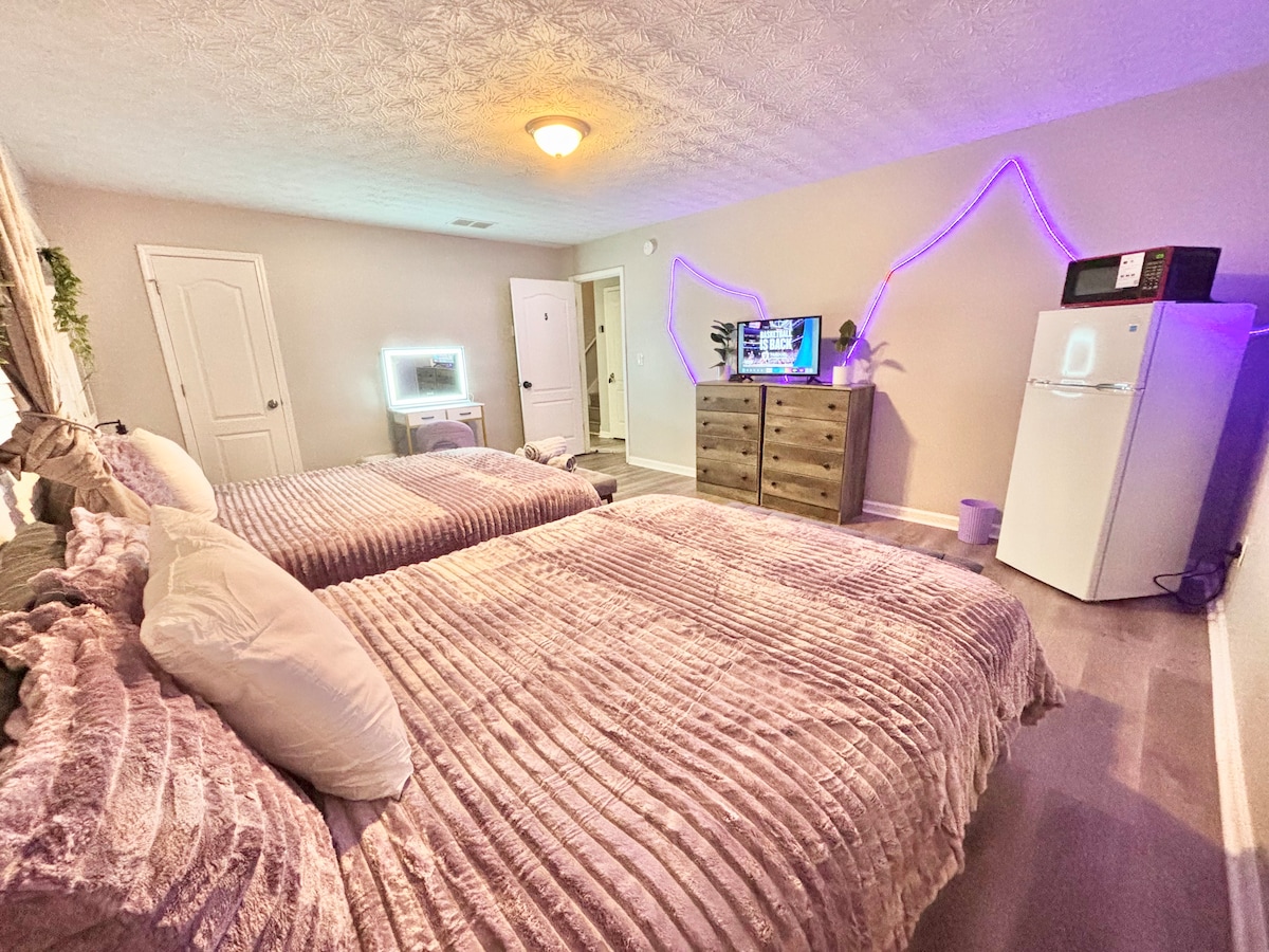 This unique home features ✅ 2 Kingsize Luxury Bedrooms ✅ 2 Queen Size Bedrooms ✅ 1 Double Bedroom Suite ✅Master has Private Bathroom W Garden Tub ✅Walk in Closets ✅ Make Up Vanities ✅32”-50” TV in the bedrooms ✅Electronic Door Lock on each bedroom While the common areas feature: ✅ Living Rooms (upstairs ) ✅ Back patio with swings ✅ Game room (garage area) ✅ Indoor Hot Tub (garage area) ✅ Computer and workspace ✅ In home gym ✅ Designated smoking areas