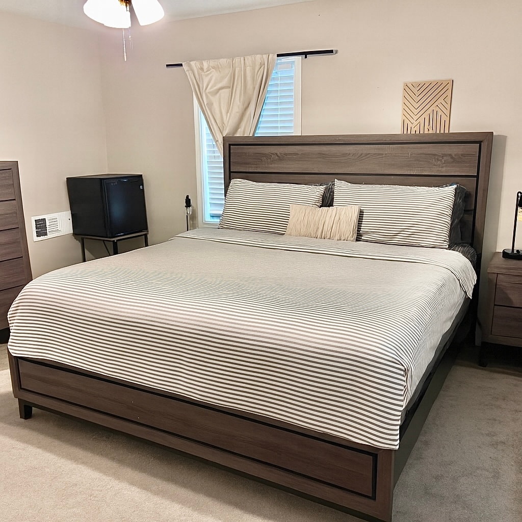 WHOLE HOME in Fayette County. 22 mins. from Airport, 15 mins. from Trilith Studios, 8 mins. from restaurants & shopping, and 30 mins. form Atlanta City Ctr. Enjoy hardwood floors (no hard bottoms), open living & dining room w/ fully equipped kitchen. Water ionizer for drinking and bidet's on each toilet. Master has king and jacuzzi and guest has queen. Dedicated office/ room for remote work and/or an air mattress. WiFi, cable tv in family room. Parking in garage. No pets, parties, or smoking