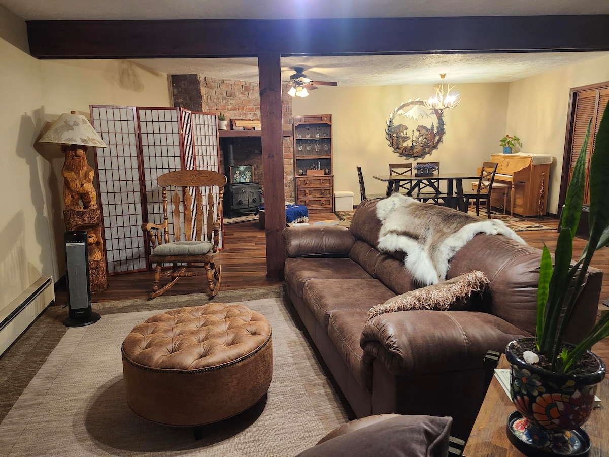 Escape to a serene woodland retreat offering comfort & rustic charm. Nestled in lush greenery, this spacious home is ideal for a tranquil getaway. Large windows fill the space with light & showcase stunning views. The living area features high ceilings & cozy furnishings, while the fully equipped kitchen provides ample counter space. Relax in the sunroom or explore the peaceful surroundings. Perfect for recharging or outdoor adventures, this serene escape awaits!