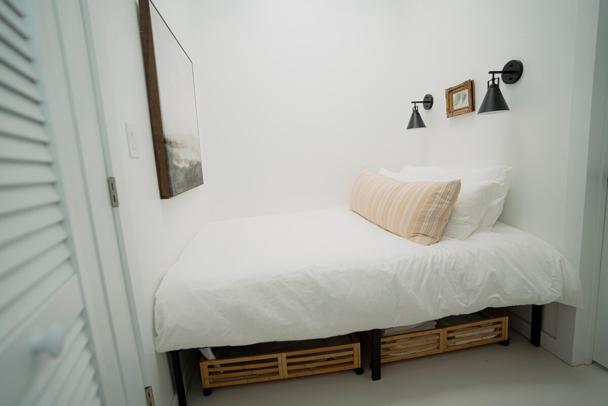 This is a cozy guestroom attached to the garage on our stunning half-acre lakefront, tree-studded property. The bedroom (double bed) and bath are quite small (not room for much luggage), but perfect for a few nights stay. We have two chairs and a little table set up right outside, and there are other relaxing spots. Check-in time is normally 3:00, but can be earlier with prior approval. We also rent out our house on occasion. They are 2 separate places non attached.