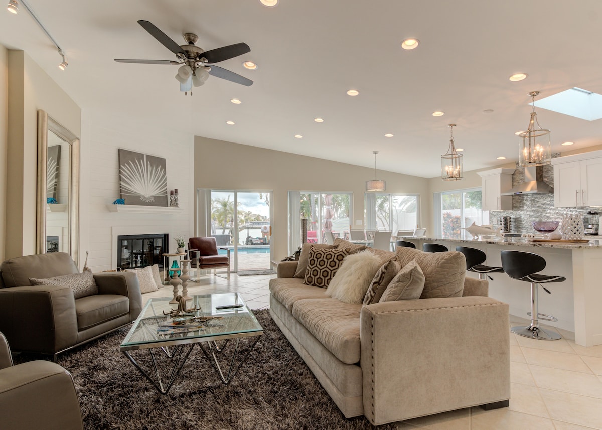 BTR#2114 This home has it ALL including incredible open water sunsets! Every detail has been carefully thought out and updated. This is a VERY upscale, coastal, single story waterfront home. A complete waterfront remodel w/ dock & pool that looks and feels like a new home w/ stunning water views from your own back patio! The water glistens and sparkles from 3 pm thru sunset and after, the sky is set on fire for 40 minutes. White sandy beach is only few blocks away! Amazing home inside & out!