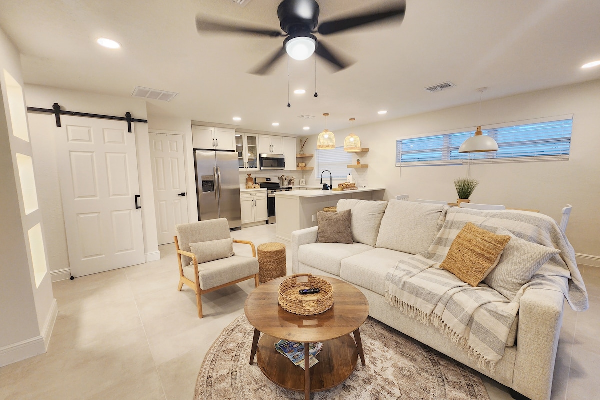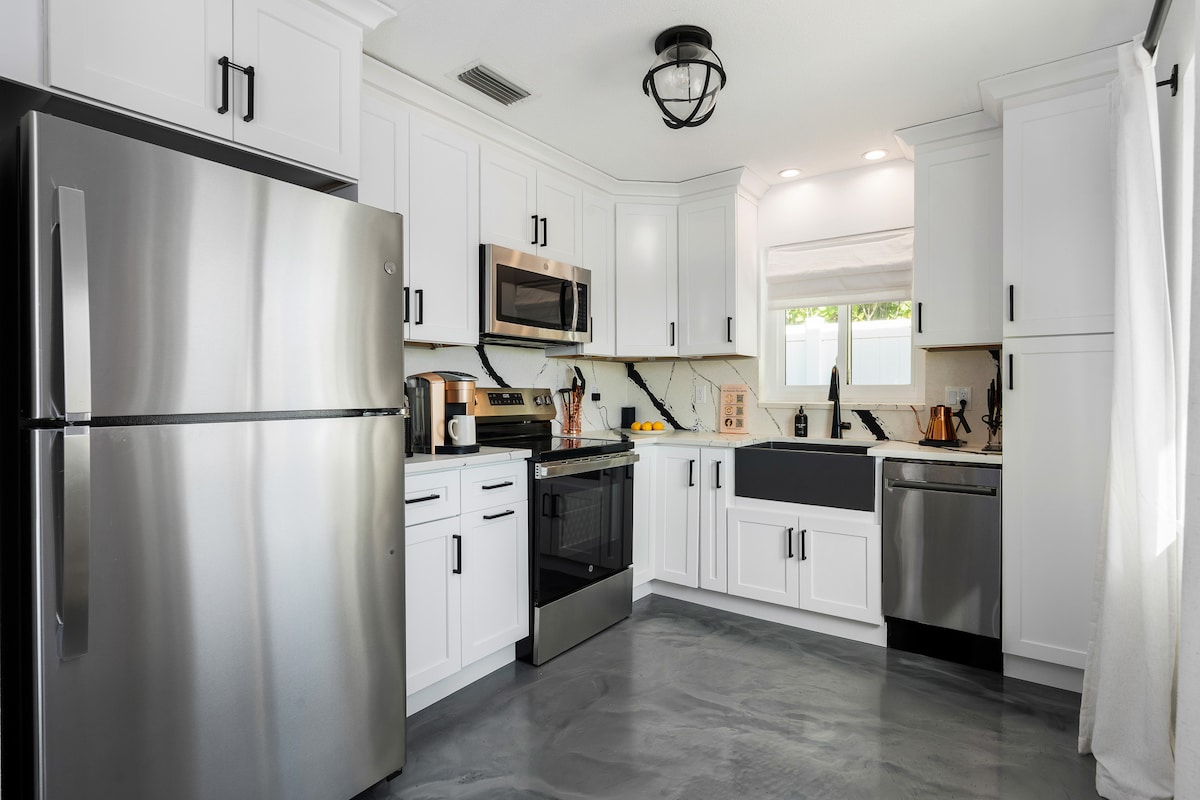 Bougie Bungalow ~ Waterfront Remodelled Retreat with Golf Cart & Dock! ★ "One of the best features in this house were the beds! Amazingly comfy!" ☞ Patio w/ outdoor kitchen, BBQ, pizza oven ☞ 2 Master suites: w/ king + bathroom ☞ Beach essentials (chairs + wagons) ☞ Fully equipped + stocked kitchen ☞ Espresso + Nespresso machine ☞ Parking w/driveway (4 cars) ☞ Multiple smart TVs ☞ 1 Gbps WiFi 4 mins → DT Indian Rocks Beach 22 mins → St. Pete–Clearwater International Airport ✈