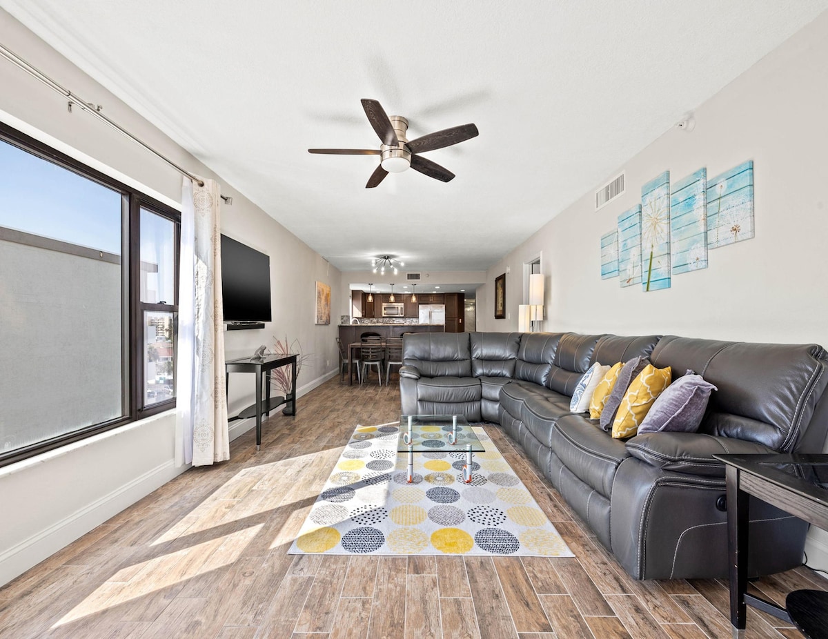 This modern chic condo hotel suite, located on the 6th, 7th, or 8th floor, offers stunning views of Mandalay Bay, Honeymoon Island, and Clearwater. It has space for 6 people between the King bed, Queen bed, and full-sized sofa bed, along with 2 full bathrooms. The balcony is perfect for people watching and seeing boats make their way to the Gulf. Please note that one of the bedrooms does not have a window