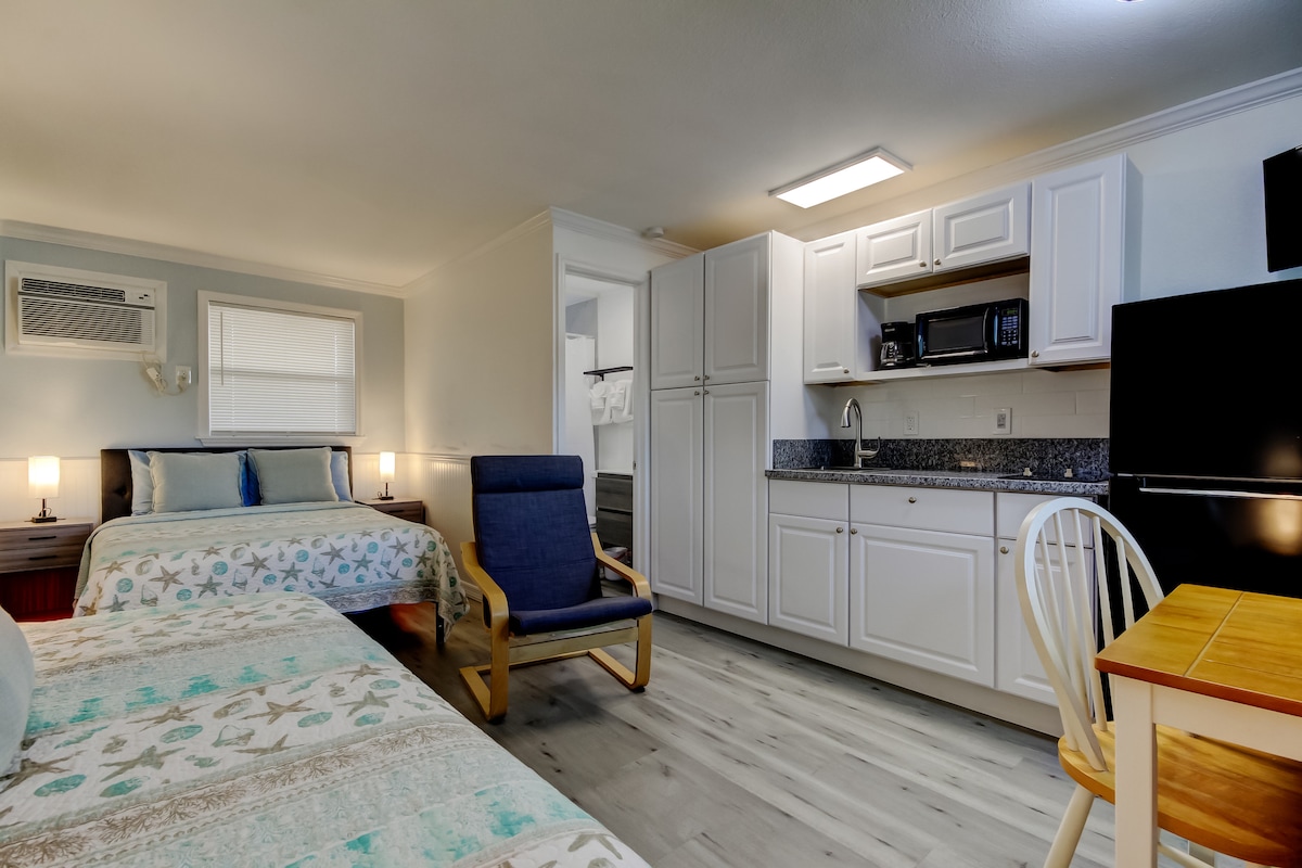 King Suite at Las Olas – Modern Comfort Steps from the Sand Soak up the sun and unwind at Las Olas of Treasure Island, a boutique coastal escape just across the street from the sparkling water of Treasure Island Beach. A King Suite within a gem of 11 clean & comfortable guest rooms designed for beach lovers. The Suite sleeps 4 with King bed, Queen sofabed, kitchenette and all the essentials to make you feel at home. Modern amenities with beachside charm. Las Olas ~ let the waves guide you!