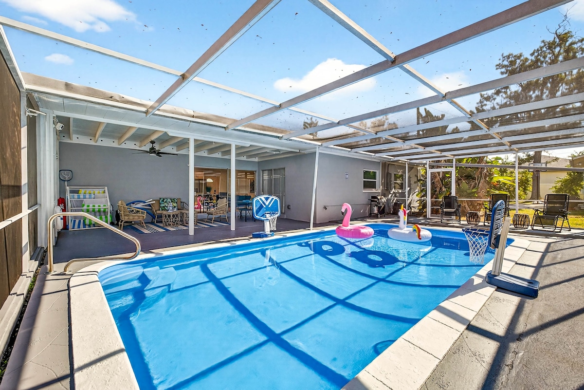 Welcome to Clearwater Hangout- This super unique house was designed to be packed with many amenities. Just 4mi to famous Clearwater Beach! Newly renovated with fresh tiles and quartz counters for a high end trendy design. Inside amenities include- LED vanity, pool tbl/ping pong, wine fridge, dining for 14, and a full transformed game room with a basketball court, Pac-man machine, and a home theatre! Outside is a very private clean space with mini golf, a salt water pool, seating area and firepit