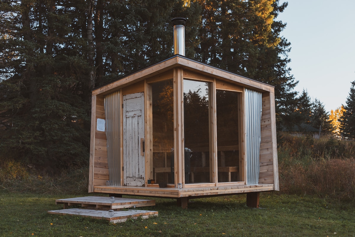Modern tiny home in the heart of Nordegg, AB—nestled in the Rockies on a golf course with mountain views. Sleeps 4 (1 bedroom + loft), full bath with heated floors, and a well-equipped kitchen (NO OVEN). Enjoy the front porch for sunrises, sunsets, and stargazing. Includes Smart TV, games, books, Bluetooth speaker. Pet-friendly and walkable to town. Shared fire pit area with BBQ and roasting sticks—perfect for cozy mountain nights.