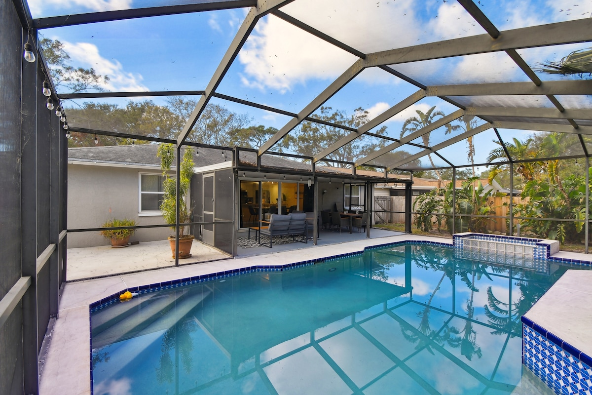 The perfect tropical paradise getaway home close to the world famous Clearwater Beach! This heated pool home with 3 bedrooms has a gourmet kitchen, comfortable beds, high-speed WiFi, & 86" Smart TV. Full resort style backyard includes amazing landscaping with Palm trees throughout, a private heated pool, outdoor bar, BBQ, lounge area, and even an outdoor refrigerator. Perfect for lazy weekends, beach days, relaxing by the pool or spa, and sipping drinks in the outdoor bar while grilling.