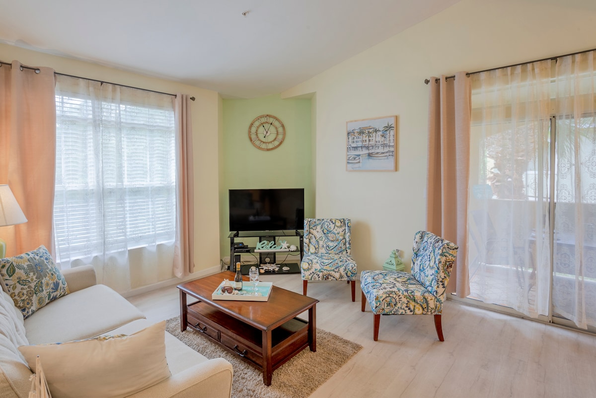 Ground Floor Completely RENOVATED! Amazing & Very cozy and it has a a 60” Fireplace. 1 king size bed and a queen pullout couch new style, 1 bathroom with the best water pressure including a rain shower and a hand held unit. This unit is well equipped with everything you need and have at your home. The condo is great for a couple’s getaway or a nice family vacation. YOUR HOME AWAY FROM HOME! Steps to the POOL, beach chairs, Floaties, wagon, cooler, etc. The Beach is a just a 10 minute drive!