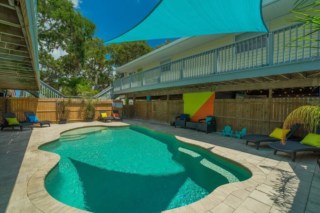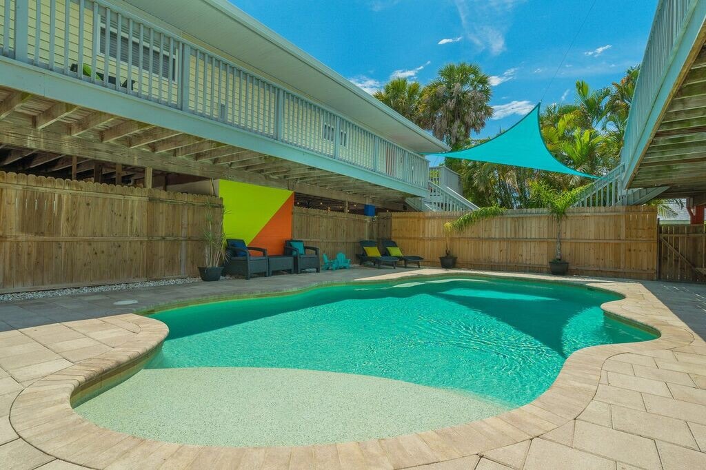 This listing is for the Blue Dolphin unit. This resort style private property consist of (4) 2bed 1bath units located just 250 steps to the white sandy beaches of The Gulf of Mexico! Common areas include, Private Pool, Jellyfish Lounge, & Game Pad. Each unit sleeps up to 8 comfortably with a king, 2 queens, and a queen sleeper! Rent all four units for your own private resort perfect for family reunions, wedding party’s, or corporate functions. Please inquire for entire property rental!