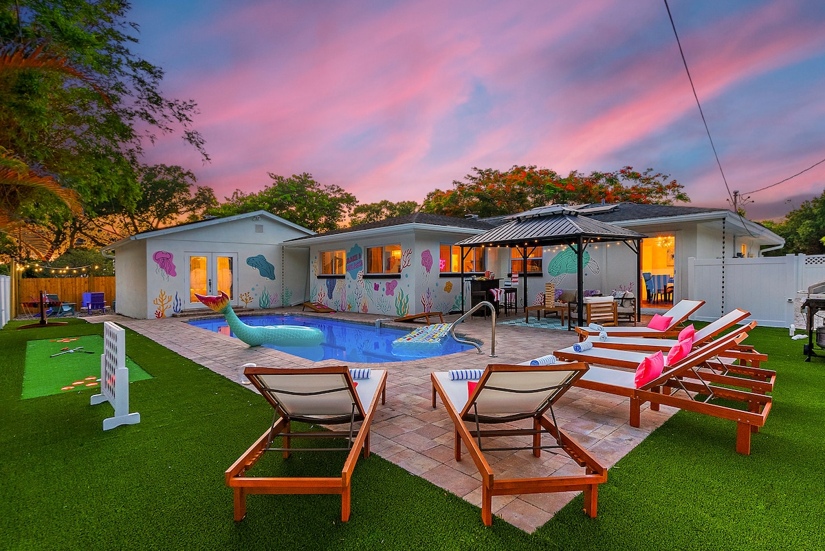 Welcome to your own private tropical paradise in Clearwater, FL! This home has been masterfully designed & loaded with amenities to give you & your family and friends an unforgettable beach vacation experience. Heated pool, mini golf-pong, fire pit, game rooms, and SO much more; you will never want to leave! 5 min - Downtown Largo 10 min - Clearwater Beach 15 min - Sand Key Park, Ruth Eckerd Hall, Clearwater Int. Airport 30 min - Tampa Experience Clearwater With Us & Learn More Below!