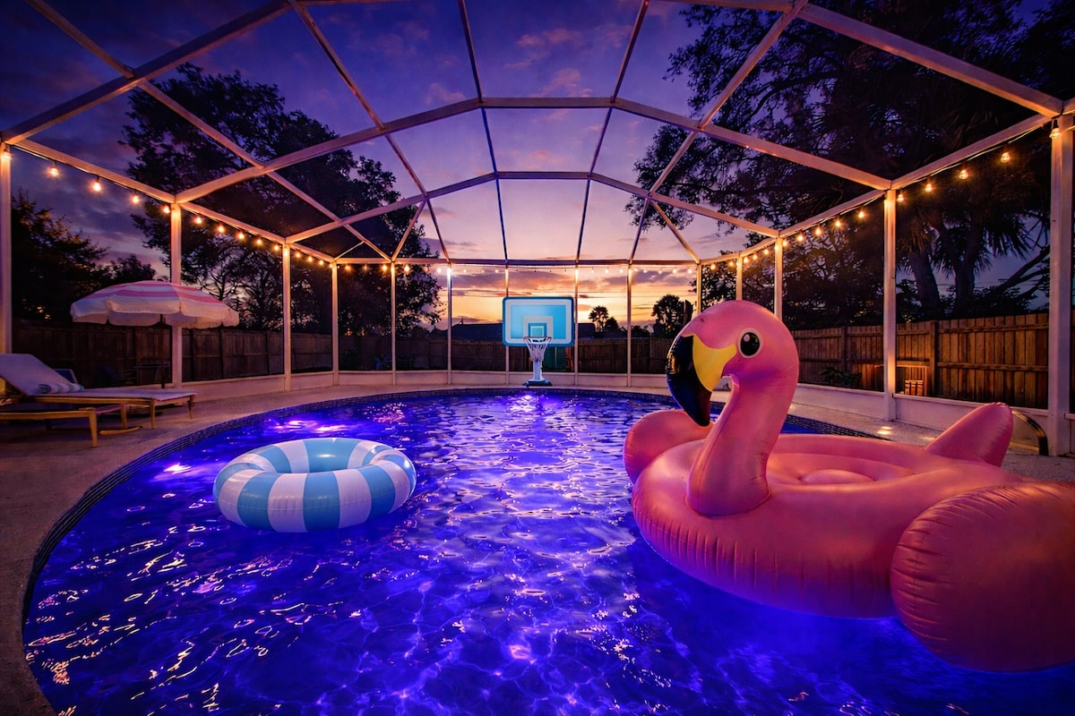 Welcome to your ultimate Clearwater getaway — just 10 minutes from the beach and Florida’s most breathtaking sunsets! This family-friendly retreat has it all: a private heated pool, relaxing hot tub, fire pit, outdoor ping pong, putting green, arcade game, foosball, and a playground — plus a professionally designed interior with tropical-boho flair that’s as stylish as it is comfortable. This isn’t just a stay — it’s an experience your group will never forget.