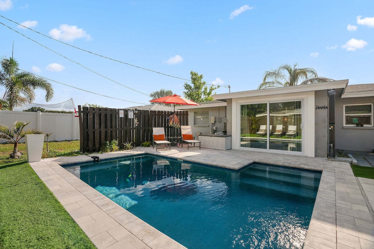 Welcome to Clearwater Hangout- This super unique house was designed to be packed with many amenities. Just 4mi to famous Clearwater Beach! Newly renovated with fresh tiles and quartz counters for a high end trendy design. Inside amenities include- LED vanity, pool tbl/ping pong, wine fridge, dining for 14, and a full transformed game room with a basketball court, Pac-man machine, and a home theatre! Outside is a very private clean space with mini golf, a salt water pool, seating area and firepit