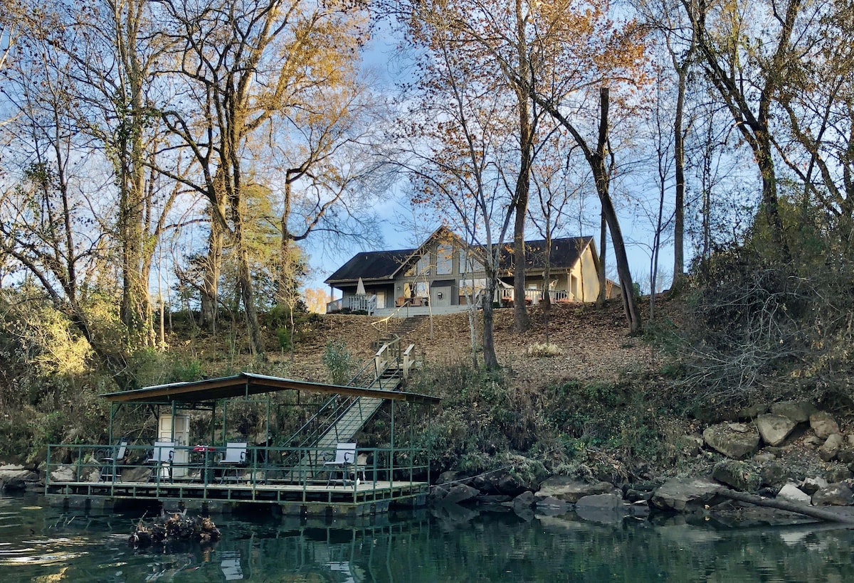 This beautiful getaway is located on the Little Red River with a fishing dock and walk in river access to Richie Shoals. Perfect for a holiday, hiking, fishing trip or just R&R. Spacious, indoor and outdoor fully stocked kitchens, perfect for grilling with fire pit or entertaining at the kitchen bar, dining room, screened in porch or 2 outdoor tables. Spectacular panoramic views of the river’s bend, and great trout fishing. Close proximity to Greers Ferry Lake or Sugarloaf Mountain.
