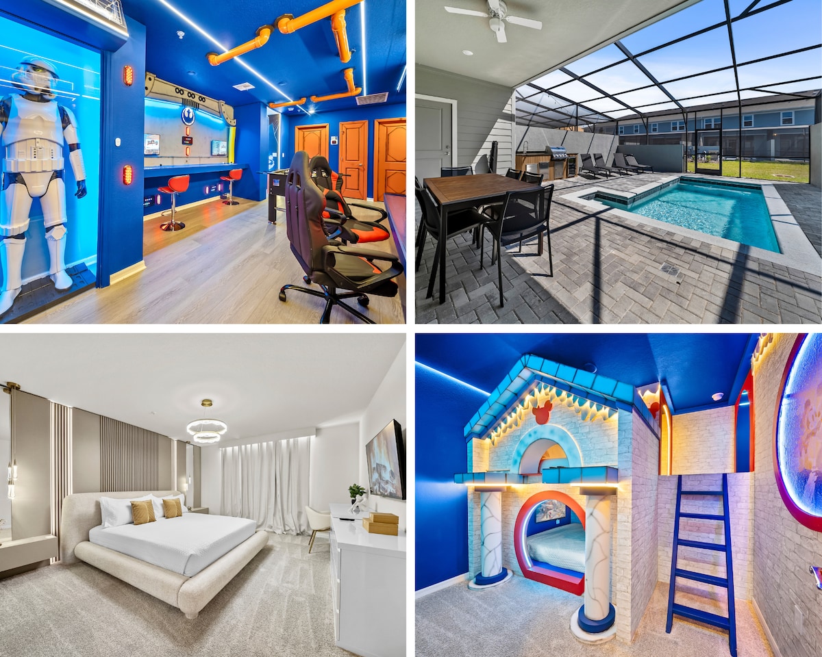 Magical 5BR Villa at Windsor Cay – Close to Disney! Enjoy luxury in our brand-new 5BR home! Kids will love our incredible Toy Story and Mickey & Minnie themed rooms. Relax in your private screened pool or enjoy the world-class Windsor Cay Resort, featuring a massive Lazy River, Water Slides, Tavern, and a huge Clubhouse Game Room. 15 min to Disney, 30 min to Universal ,Steps from luxury resort fun! Perfect for families. Book your dream vacation today!