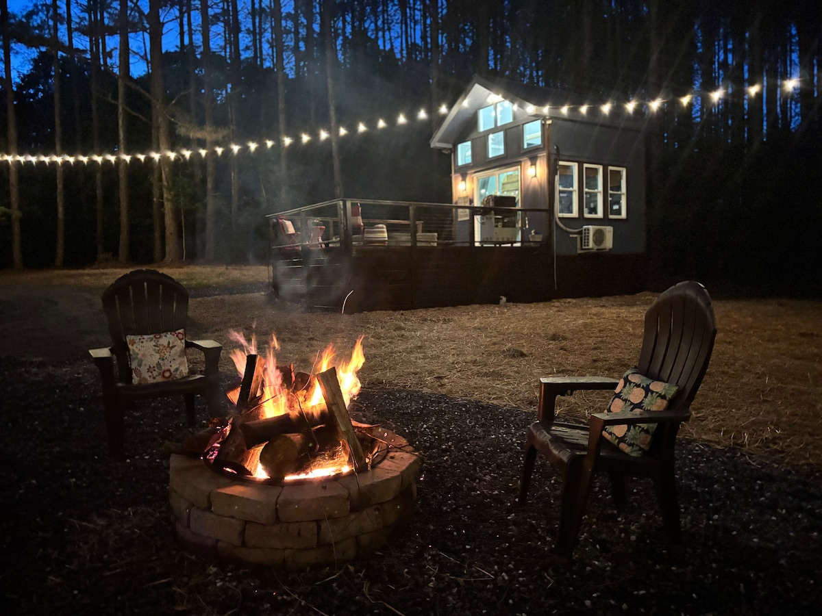 Welcome to your dreamy forest escape! This tiny cabin is all about cozy vibes, fresh air, and total relaxation. Sip coffee on the deck, chill in the hammocks, and soak up all the peace and quiet. You can unwind under the stars in your private hot tub, sit by the fire pit and let nature surround you. Stay connected with high-speed Internet and a flatscreen TV for your entertainment. Book your stay today and experience the charm and comfort of Tiny House living.