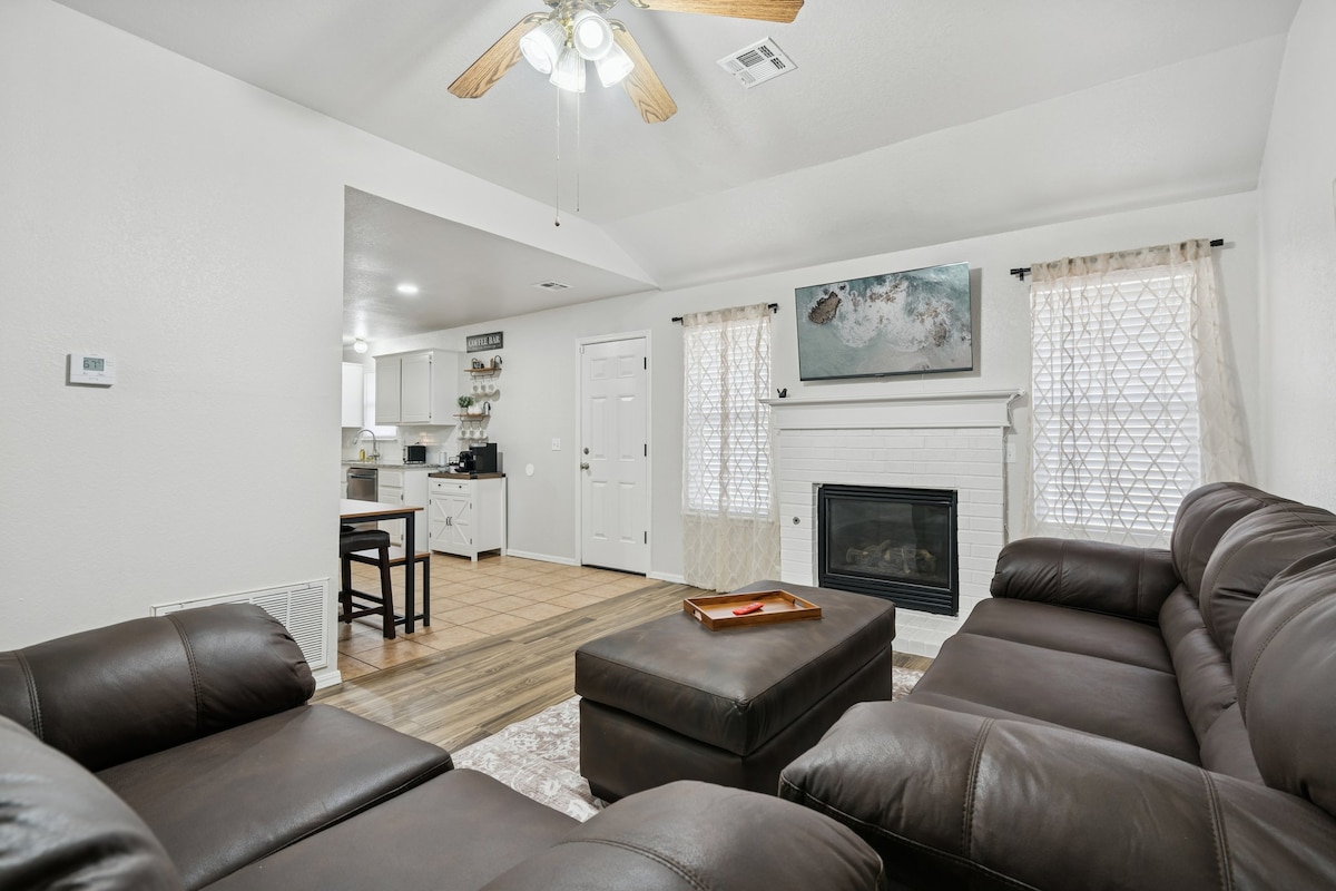 Open living area with fireplace and cozy atmosphere. The Kitchen is well stocked with large and small appliances including air fryer and coffee maker. Master bedroom has a King size bed. All bedrooms have top quality Pillows and Mattresses with pressed quality linens as well as pillow and mattress protectors for cleanliness and health for guests. All bedrooms have chests/dressers, walk-in closets and TV's. Home also has 2 full bathrooms as well as full size washer/dryer in the utility room.
