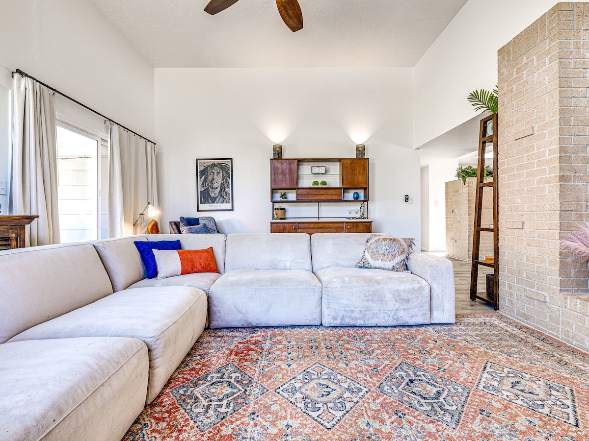 THIS IS A DUPLEX. Very quiet 3 bed 2 full bath offers unique private front courtyard, and back outdoor living room with TV & grill. Modern interior filled with art. Open living/dining/kitchen. Primary bedroom suite features KING size bed, 55” Smart TV, and spacious bathroom with walk-in shower. Secondary bedroom features KING size bed and TV. Perfect location minutes to restaurants and shopping. Out of town guests only. Easy access to all major interstates. Pets allowed ($40 per stay. )