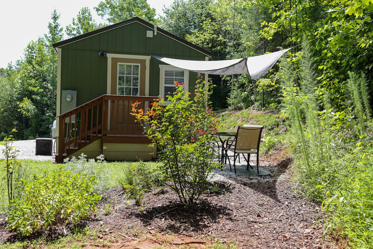 Cozy tiny home cabin in the Blue Ridge Foothills, near mountains for hiking or biking, Table Rock and Sliding Rock, small town shopping and eating; between Greenville, SC and Hendersonville, NC. Perfectly outfitted for a night or week. Dog lovers we have a fenced in dog park! Extra guests? There is a cleared space for your TENT beside the Cabin for $20. Message me to reserve it. Or also reserve my Airstream or Trolley. Here during the week? Check out our Wednesday evening Farmer's Market.