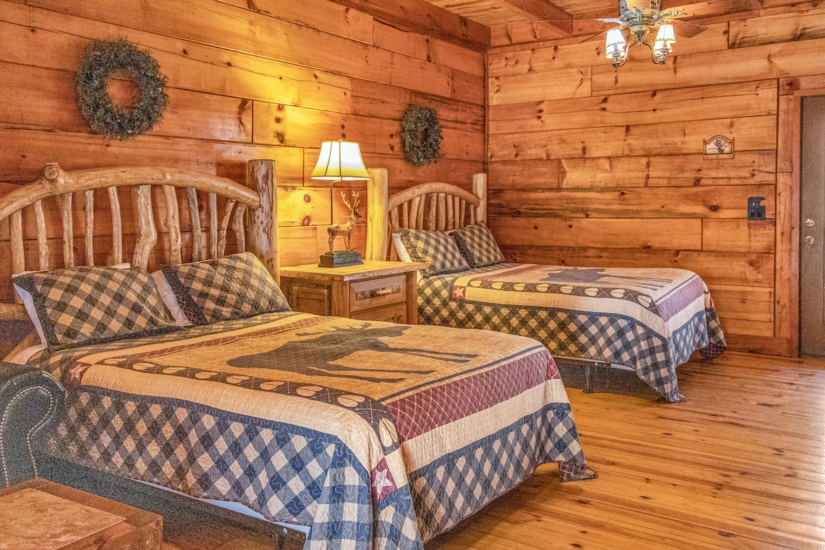 Enjoy easy access to Tellico River, beautiful scenery and restaurants from this rustic log decor townhome. The Riverfront Lodge is a great place for large groups that want to stay together but have their own private space to stay in. You can relax while setting in a rocking chair on the spacious shared back porch then gather round the fire pit in the evening and listen to the river roll by.