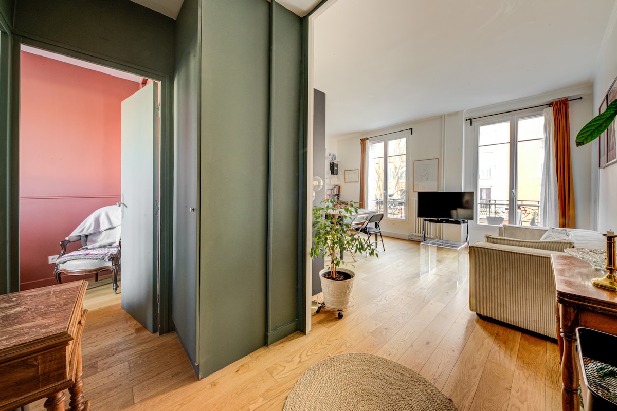 Welcome to our charming and bright two-room apartment! With the metro just a 2-minute walk away, you can reach the heart of Paris and its many attractions in just 15 minutes. Our apartment, located on the first floor of a quiet condominium, enjoys a prime location in the heart of a lively neighborhood filled with quality shops. Despite this proximity, the street itself remains quiet, providing a peaceful retreat after a busy day.
