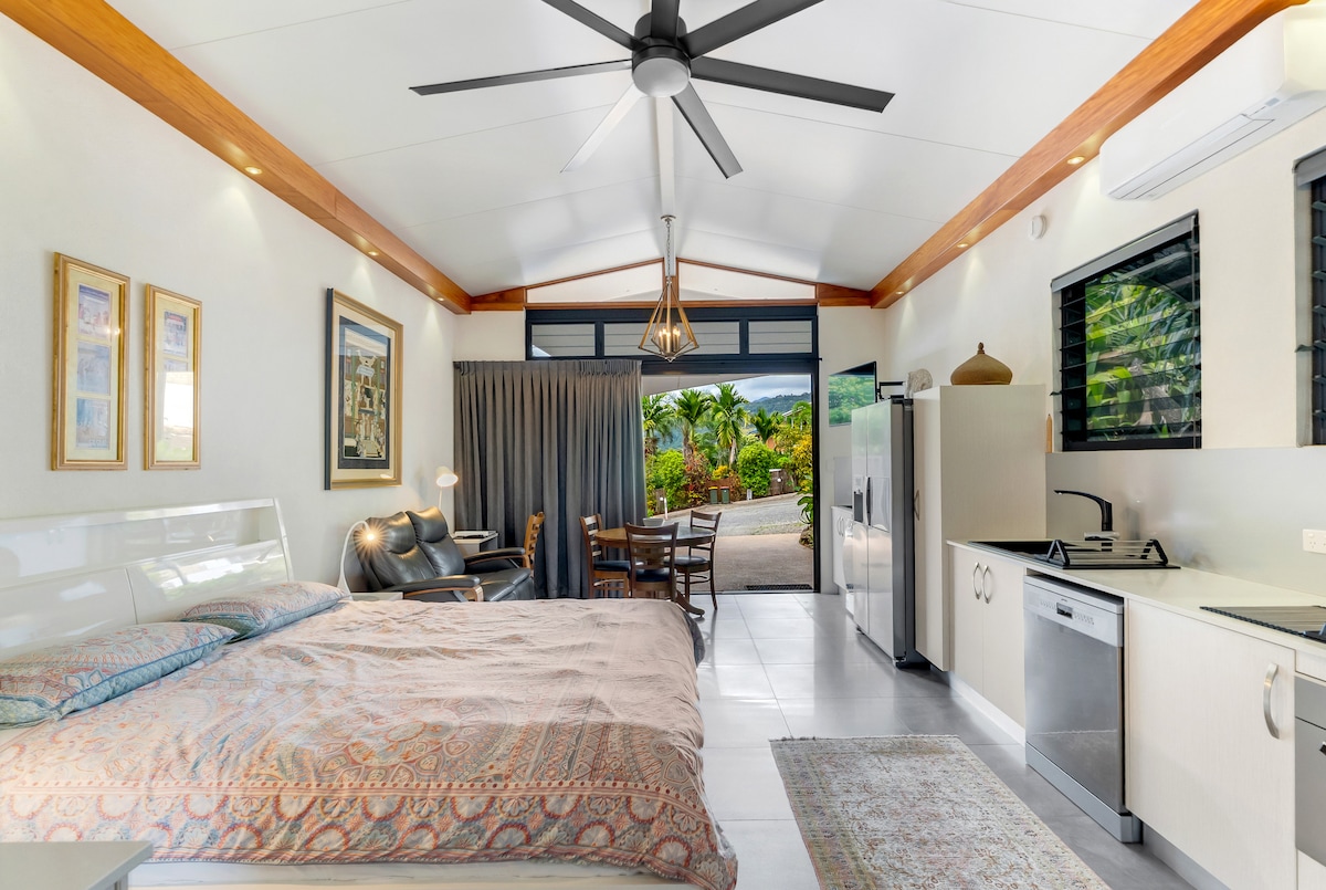 This self-contained, open-plan, stand-alone executive Studio Suite Guesthouse is stylishly decorated with quality comforts. Plunge pool with views. Great location at Smithfield Heights north of Cairns city. Wake up to the sound of birds. Easy travel access to Beaches, Port Douglas, Daintree, Kuranda, Atherton, and Mareeba Highlands. Walk to University and shops. Stay Includes - Welcome snack provisions. Quality Hospitality "Essentials" provided, plus additional Consumables.