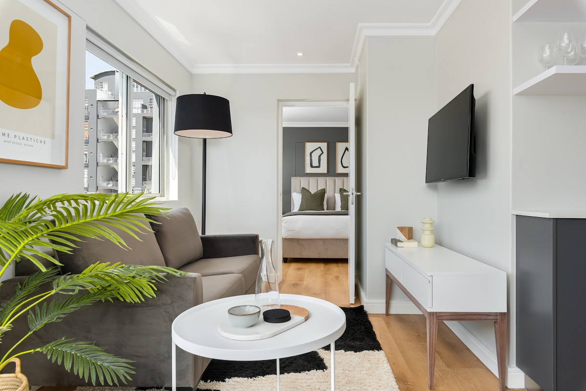 This apartment is a quiet haven of tranquility. Luxurious touches include a marble-topped dining table, quality bed linen, selection of books and artworks which set the space apart from so many hotel rooms out there. This spacious apartment offers everything - a stylish space, spectacular views, fast wifi, daily housekeeping, secure garage parking, Netflix, access to a gym and pool. 24/7 front desk and security means to accommodate late check ins. Beautifully decorated in a calming neutral palette. Text host directly to arrange access. Guests arriving after hours can collect key from 24hr concierge (by special arrangement.) Level of interaction is guest determined Located in the city centre, this is a vibrant area and the ideal place to base yourself to explore Cape Town's major attractions! The V&A Waterfront, Table Mountain, Clifton and Camps Bay beaches, CTICC, and Museums are all a short drive away. There are many restaurants, bars and coffee shops within walking distance. My City Bus transportation system. Taxi/Uber Free wifi, apartment is serviced