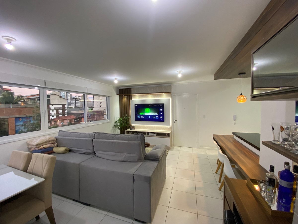 Apartamento amplo (82m/2) com garagem, ar condicionado e churrasqueira. A sacada é integrada com a sala, tendo uma bela vista da praia. A cozinha é espaçosa, bonita e completa. Tem Wi Fi e bancada para notebook. Tem um quarto amplo com cama queen, um banheiro, um lavabo e área de serviço. Ideal para 2 pessoas, mas tem colchões de solteiro na sala, podendo acomodar mais duas pessoas. A televisão fica no quarto, mas pode ser colocada na bancada da sala.