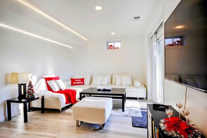 Have fun and relax at this stylish oasis! Packed w/ amenities. Huge Pool w/multiple cabanas, HOT TUB, trampoline, playground, axe throwing, pool/ice hockey table, arcade,huge theater room and outdoor projector too, basketball court, grill, spa/library with sauna and full gym!! 5 comfy beds. Rooms split for privacy. Open kitchen/dining/living room. Cold DeerPark water fountain. Basement apt so there is some movement noise. Updated bath and an outdoor shower. 20 mins from Downtown DC & 6Flags.