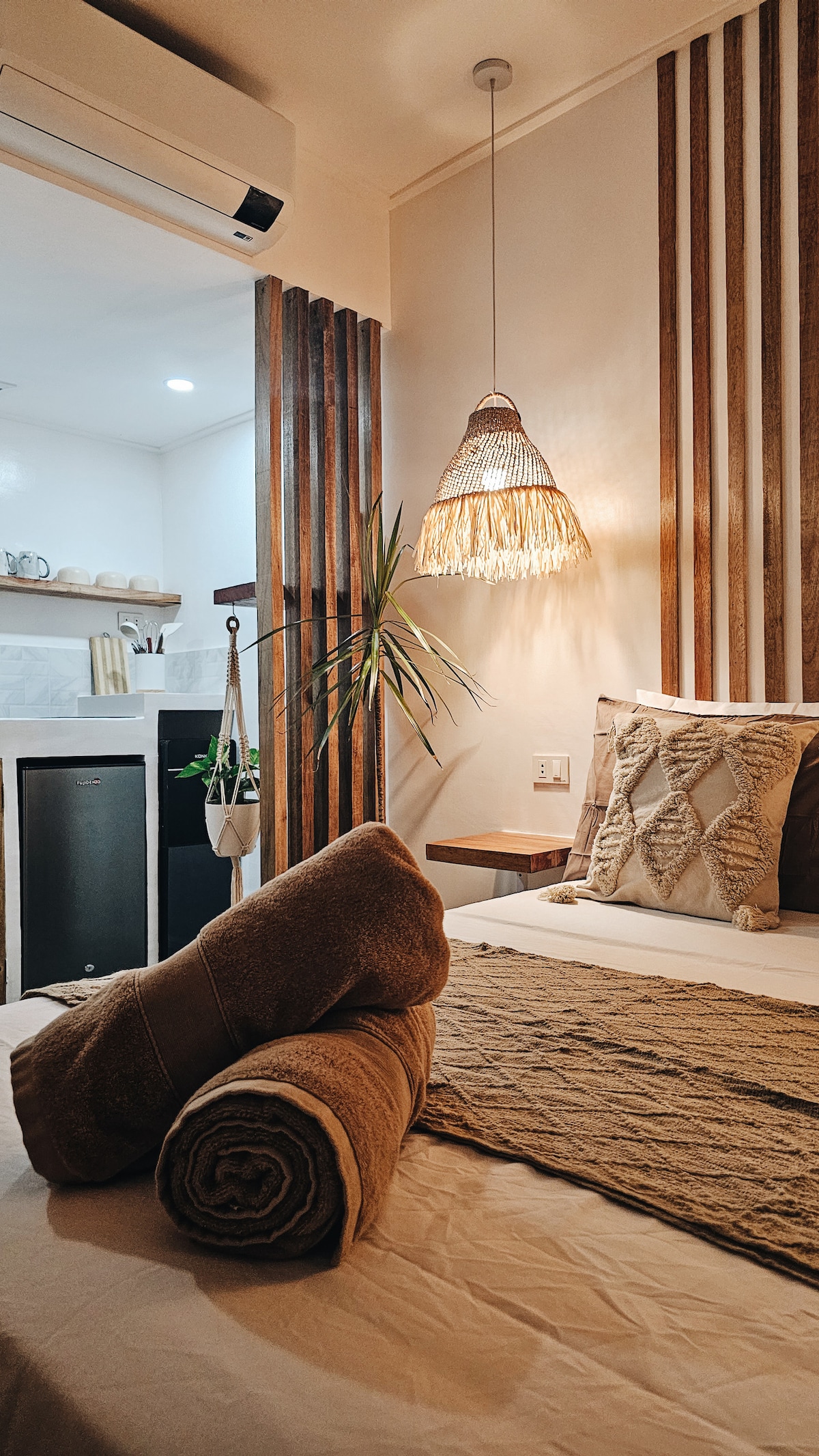 Welcome to Siargao’s premium apartments. Stylish, modern and centrally located in General Luna. Our lofts feature 5 meter high glass doors for ample natural light, automatic curtains for shade and memory foam pillows and an orthopedic mattress in Egyptian cotton! We also run on solar most of the time with back up batteries and generator for power outages, AVRs to protect all your gadgets from power fluctuations, Starlink. Cloud 9 is a 12 minute walk while the bridge is 5 minutes.