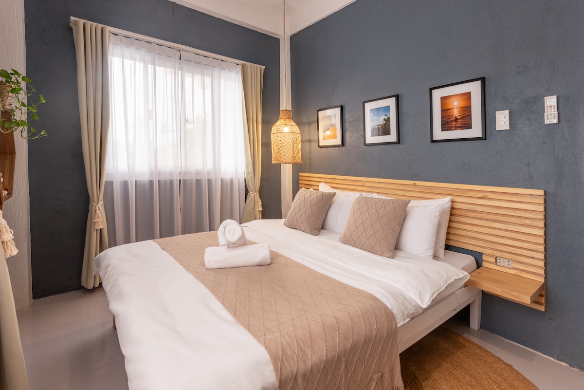 Brand new apartment ideal for digital nomads. located in a peaceful yet central residential area - within 10 minutes walk to Cloud 9 and AFAM bridge, and 10 minutes by tricycle into the heart of General Luna. The room has a queen bed with comfy mattress and duvet, fast Starlink WiFi, Smart TV, AC, large bathroom with hot shower, kitchen with utensils, fridge, working desk and office chair, and private veranda. We have two units available, this listing is for the upstairs room (first floor).