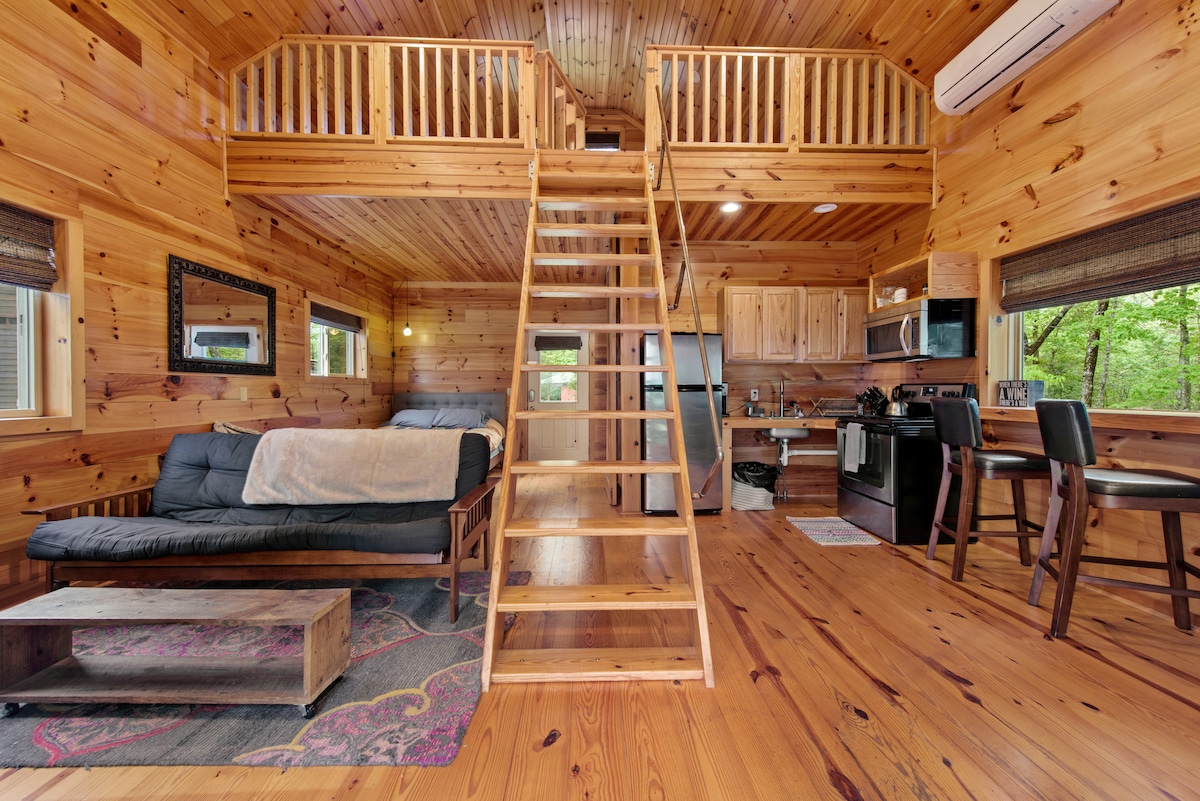 This tiny home is on the historic home site of Fannie Mennen and the Plum Nelly Clothesline Art Show. She even named the road. The home is brand new, artfully decorated and has 1 double bed, 1 bath, a sleeping loft with 2 twin beds, and a queen sleeper sofa. The view is from 2000 ft elevation and looks into the valley and across to the mountain again. There is civil war history on the property. There is a 100 ft drop so guests are asked to not stay here with young children.