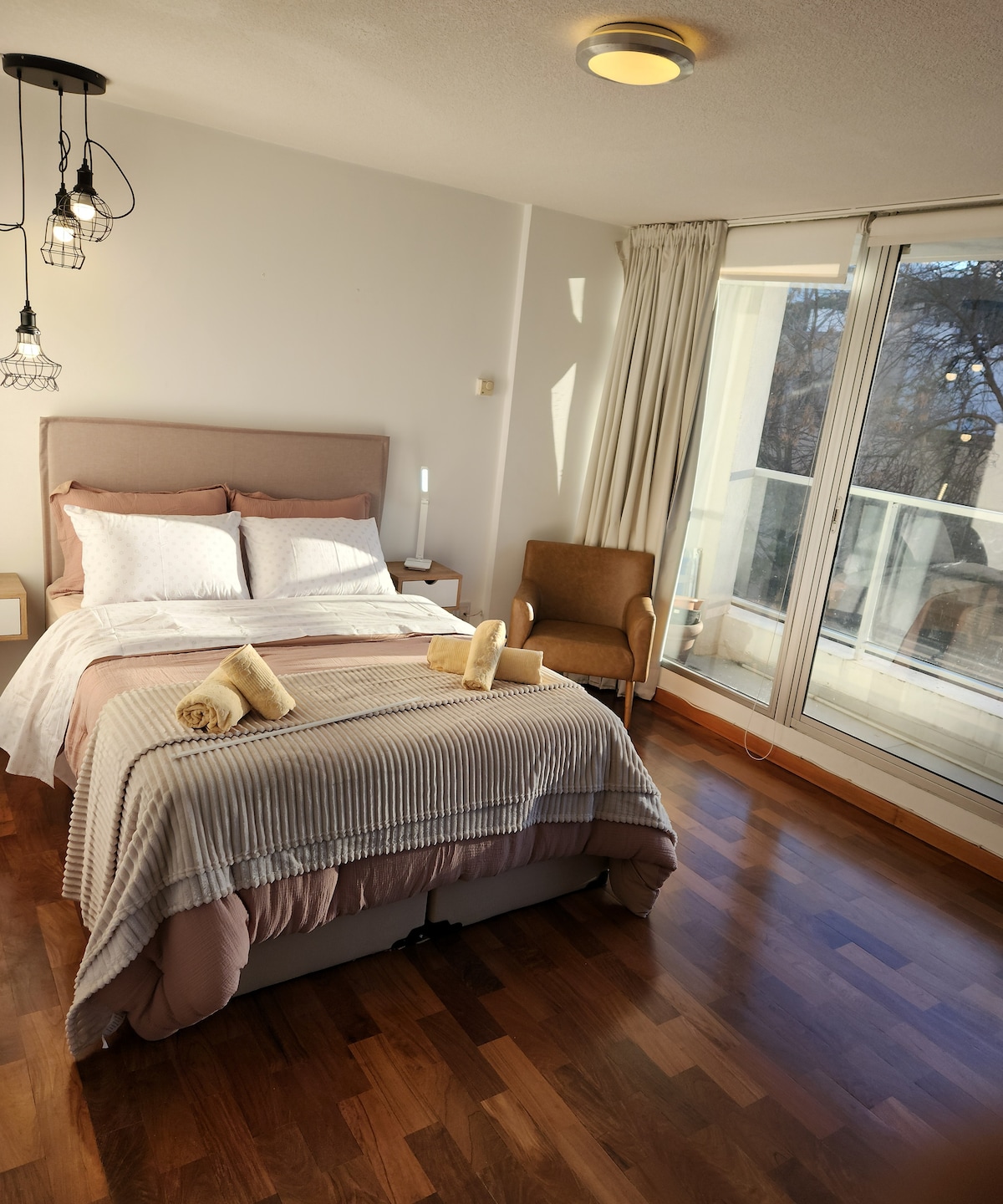 Luminoso, con amplia terraza orientada al NE, smart TV, WIFI. Hermosa vista de la ciudad. Amplios espacios interiores y exteriores de uso común: roof top con piscina, solarium, gimnasio, laundry, cine, 2 parrilleros, ámbito cuidado y refinado. Ubicación excepcional, 1.5km de Playa Ramírez y 1.5km de Playa de los Pocitos, a metros de Punta Carretas Shopping, a 4km de Terminal Tres Cruces. El uso del gimnasio y piscina son libres, los parrilleros se reservan con un costo mínimo para limpieza.