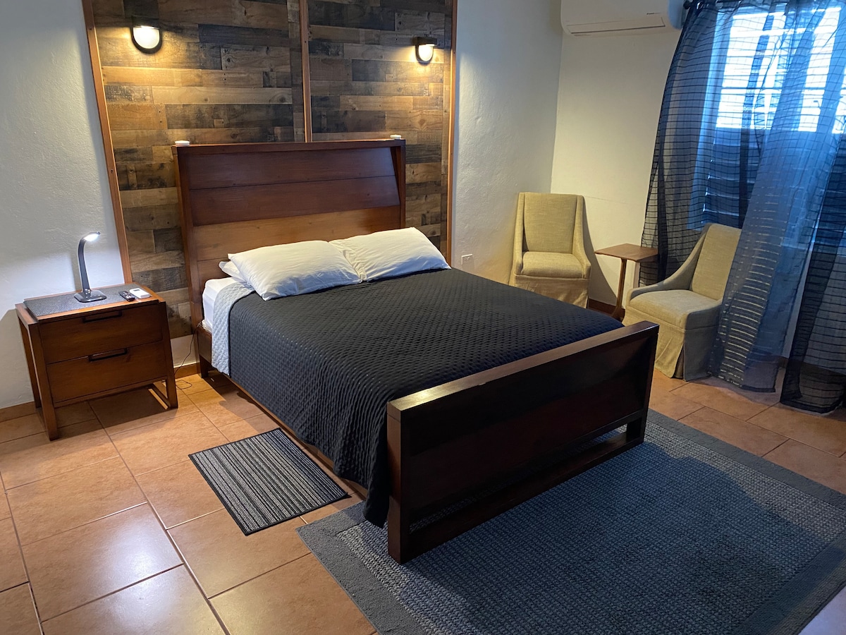 Saddle-roofed 1-bedroom apartment on a second story house surrounded by nature and banana trees near Joyuda beach, in CABO ROJO. It has a private bathroom (outside main living area), living room, and kitchen. Powerful A/C units. PRIVATE entrance. Distances: Joyuda, 4 mins; Boquerón, 15 min; Combate Beach, Lighthouse and Salt Flats, 25 mins; La Parguera, Lajas, 30 mins.