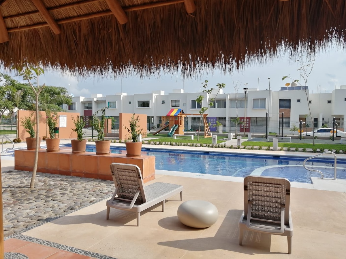 The apartment is the ideal place to spend an unforgettable stay in Manzanillo. ✨ Just 5 minutes by car / 10 minutes walking to the beach. 🏝️ Located on the first floor facing the pool and the palapa. 🏖️ You have restaurants, bars, and supermarkets nearby within walking distance. Great location. 🍳🦐🦪🌮🍔🍕🍣 The common areas include a garden, palapa, pool, bathrooms, showers, and a play area. 🛝🏊🏻♀️🛟🙌🏻