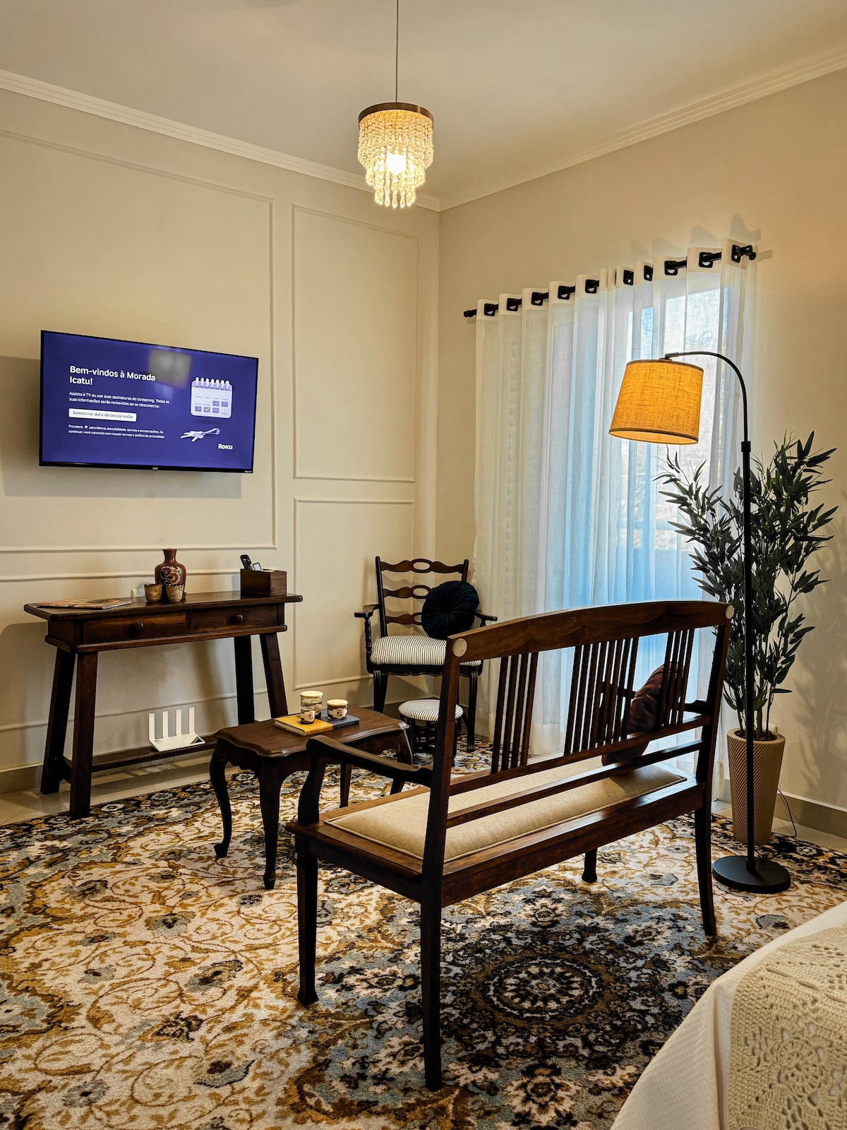 Que tal viver uma experiência de hospedagem única? Aqui na Cabana Rústica cada detalhe foi cuidadosamente pensado para que tenha uma experiência inesquecível em casal. - Janelas panorâmicas - Lago de pedras; - Rede náutica e rede de descanso - Lareira externa - Cama Queen Size - SmartTV - Ar-condicionado - Som Bluetooth - Banheiro com teto panorâmico - Banheira - Cozinha integrada - Wi-Fi de alta velocidade.